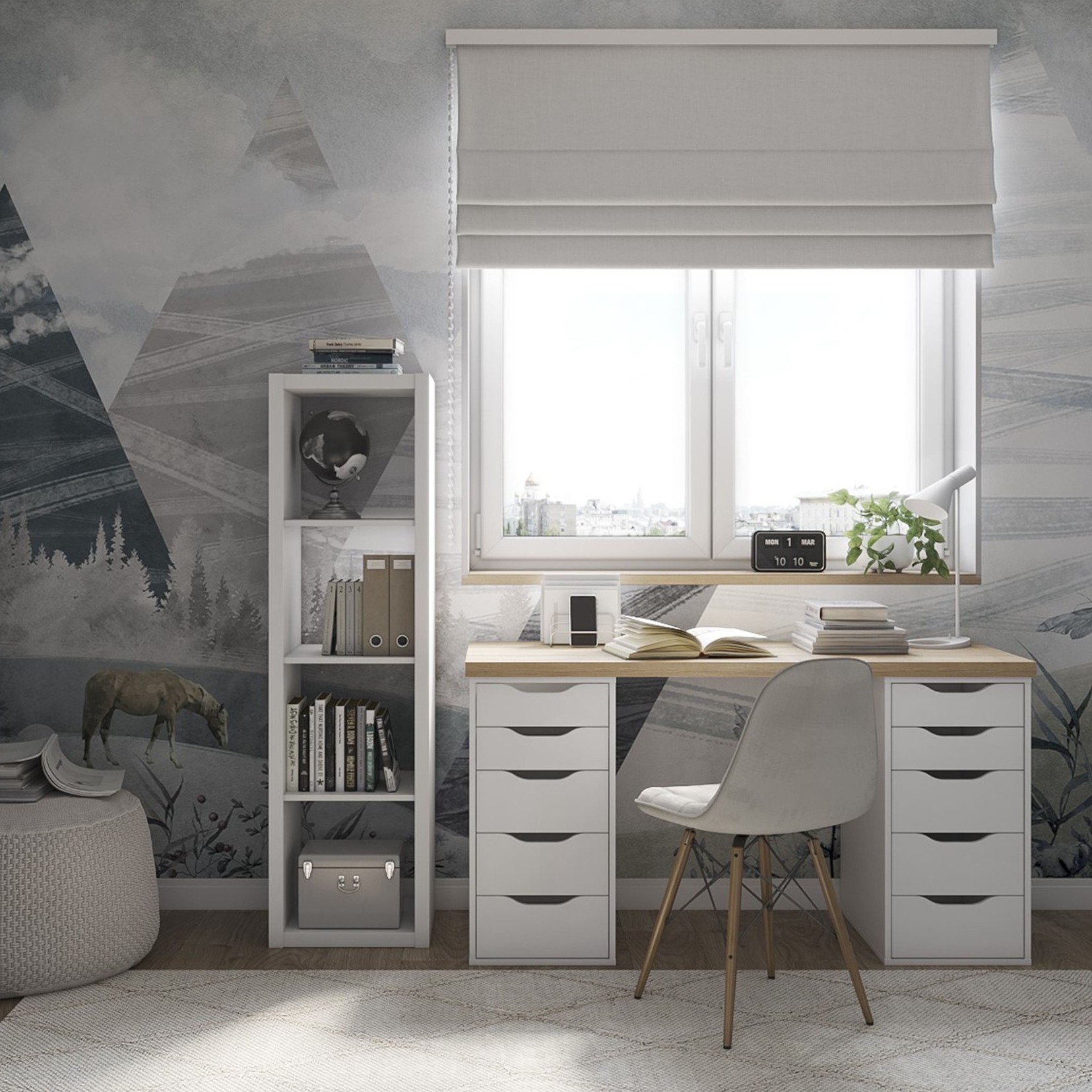 Материал: ДСП (полки и перегородки — 15 мм), бумага с пигментом (поверхность), тамбурат (рамка из ДСП и HDF с сотовым заполнением).