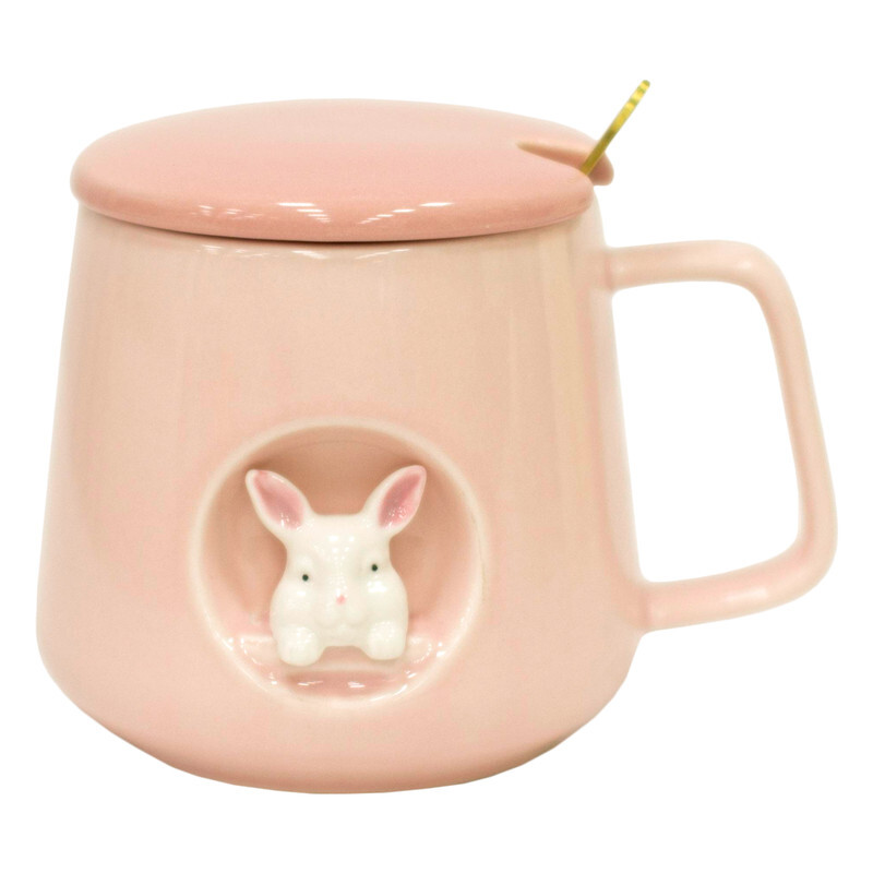 Керамическая кружка с крышкой и ложкой (10x7.8cm), розовый, 380 мл