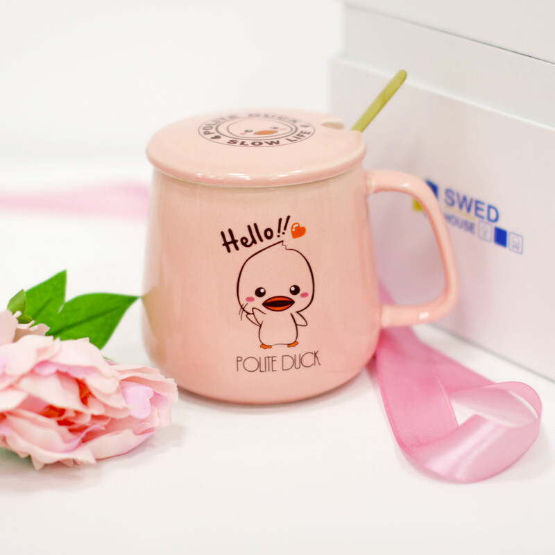 Керамическая кружка с крышкой и ложкой, 9.8x8 см, розовый, 410 мл