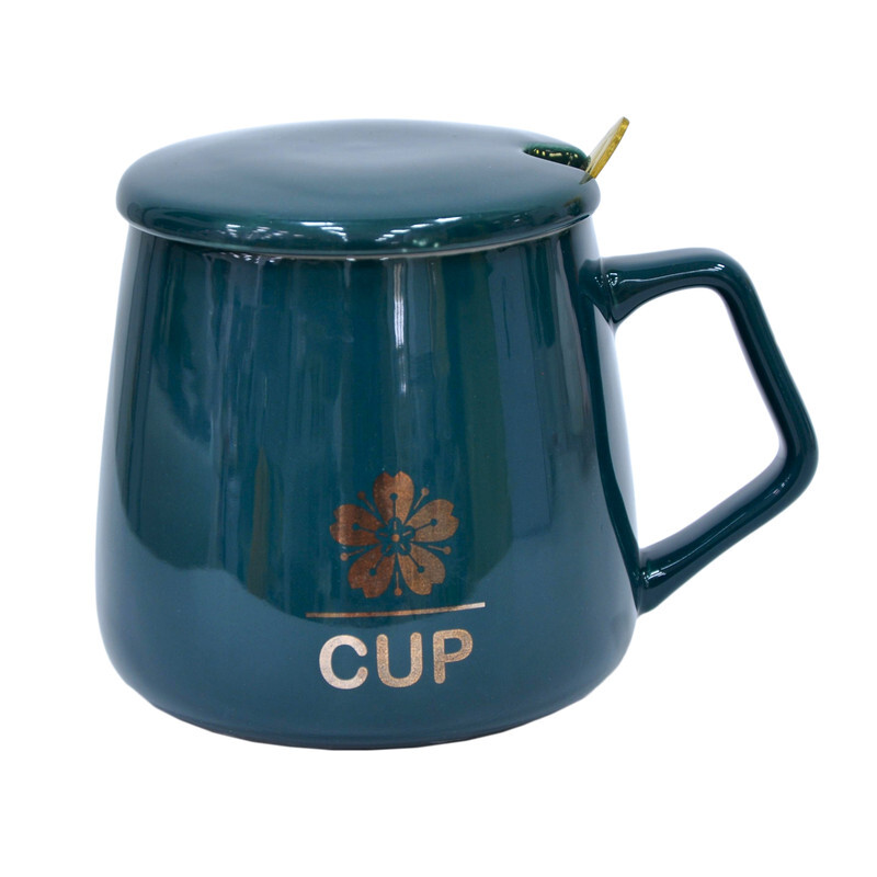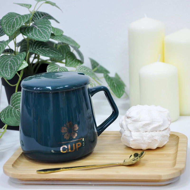 Керамическая кружка с крышкой и ложкой, темно-зеленый, 9.5x7.7 см, 400 мл