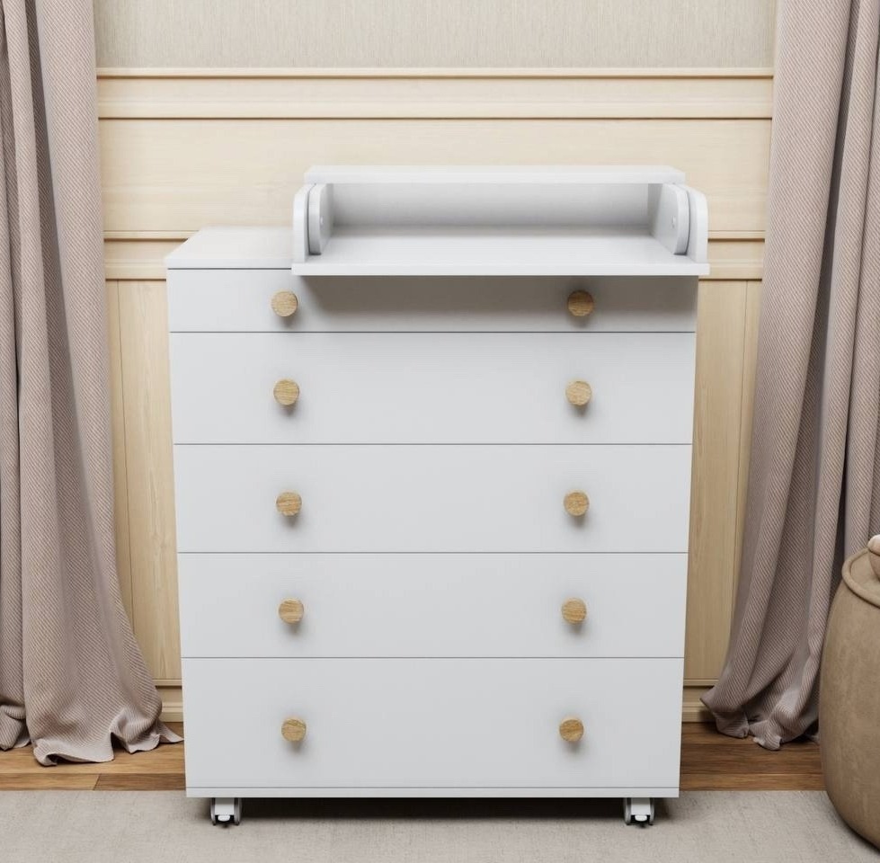 Этот комод — незаменимый предмет для детской. Он сочетает в себе функциональность пеленального столика и классического комода для хранения вещей. Съемная пеленальная доска с защитными бортиками легко перемещается или убирается по мере роста ребенка. Четыре прорезиненных поворотных колеса (два с фиксаторами) обеспечивают удобное перемещение. Пять вместительных ящиков на шарикоподшипниковых направляющих, верхний ящик с органайзером. Закругленные углы гарантируют безопасность малыша.