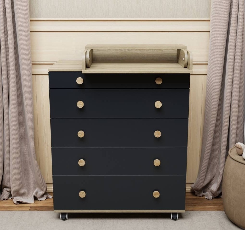 Этот комод — незаменимый предмет для детской. Он сочетает в себе функциональность пеленального столика и классического комода для хранения вещей. Съемная пеленальная доска с защитными бортиками легко перемещается или убирается по мере роста ребенка. Четыре прорезиненных поворотных колеса (два с фиксаторами) обеспечивают удобное перемещение. Пять вместительных ящиков на шарикоподшипниковых направляющих, верхний ящик с органайзером. Закругленные углы гарантируют безопасность малыша.