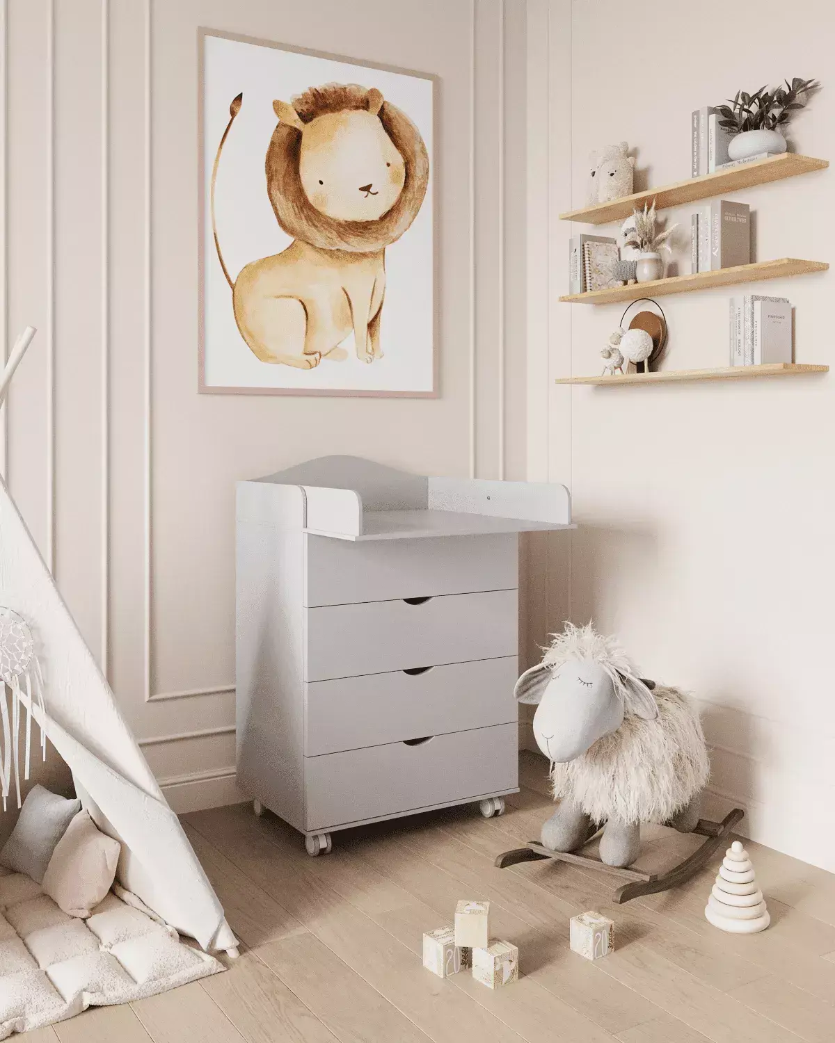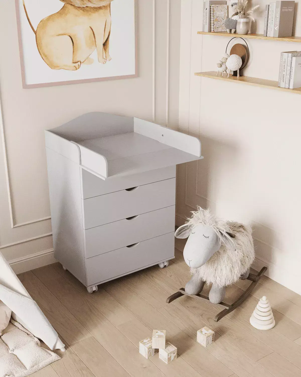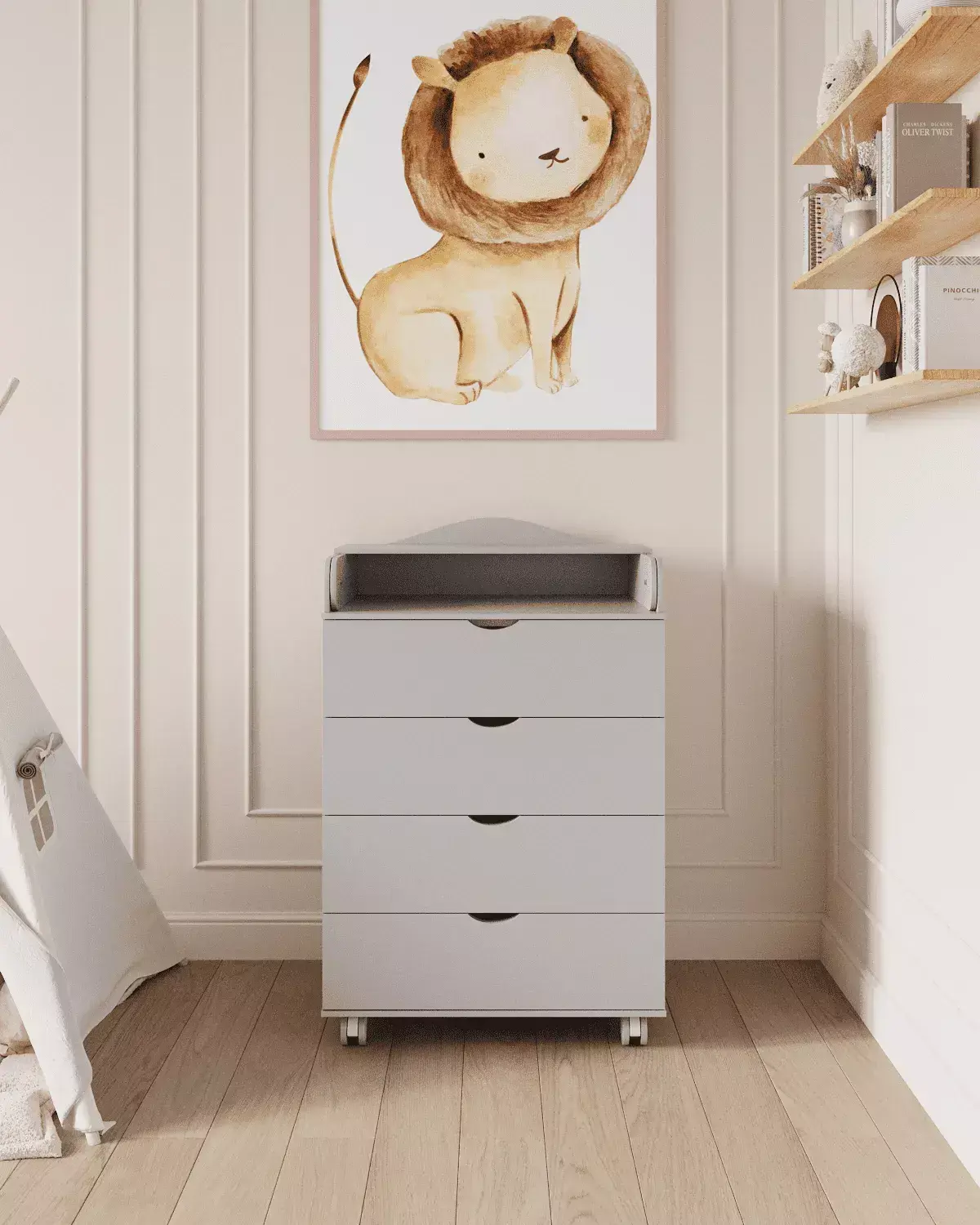 Практичный предмет мебели, комод с пеленальным столиком станет непременным спутником в детской комнате. Этот функциональный пеленальный столик не только поможет сэкономить место в комнате, но и позволит освободить пространство благодаря своему удобному механизму сложения. В дальнейшем его можно использовать как дополнительную полочку для аксессуаров