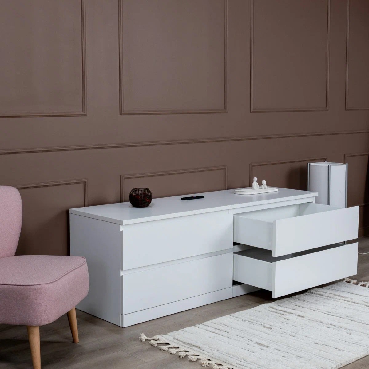 • Направляющие скрытого монтажа с доводчиками: Комод оснащен современными направляющими скрытого монтажа, которые обеспечивают плавное и бесшумное выдвижение ящиков. Доводчики гарантируют мягкое закрытие, предотвращая случайные удары и повреждения.