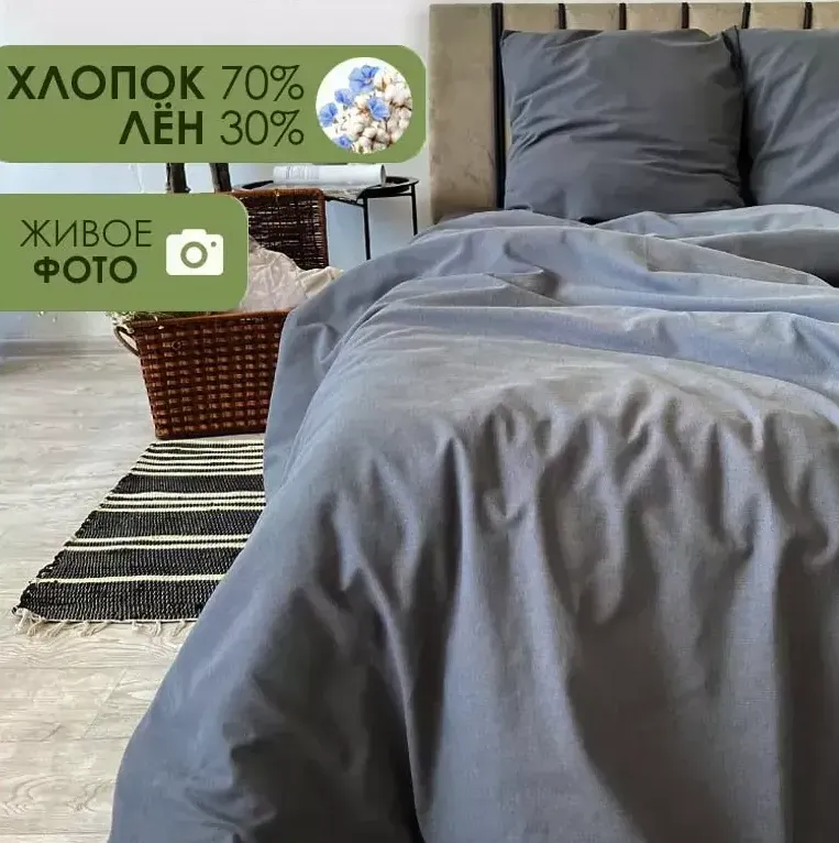 В комплекте постельного белья 1,5 спального: пододеяльник 215х153 см – 1шт, простыня 215х150 см -1 шт, наволочки 50х70 см - 2 шт. Состав: 30% - лён, 70% - хлопок.