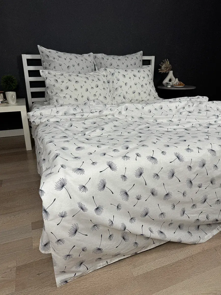 В комплекте постельного белья 1,5 спального: пододеяльник 220х215 см – 1шт, простыня 240х220 см -1 шт, наволочки 50х70 см - 2 шт.