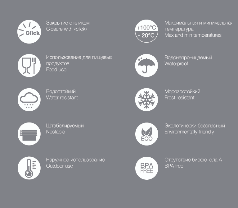 • безопасность (отсутствие бисфенола А, приводящего к эндокринным нарушениям) — контейнеры подходят для хранения пищевых продуктов;