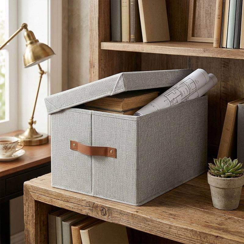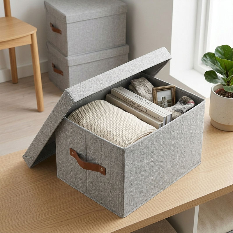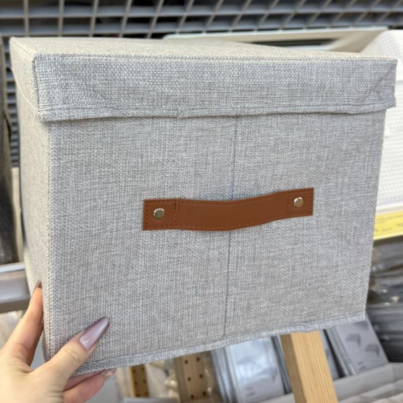 Вместительная коробка с крышкой для хранения одежды, игрушек и аксессуаров, швейных предметов. Легко выдвигать и поднимать благодаря ручкам. Материал и уход: Основные части: 100 % полиэстер. Вставка: цельный картон. Не отбеливать. Не сушить в стиральной машине. Не гладить. Не подвергать химической чистке.