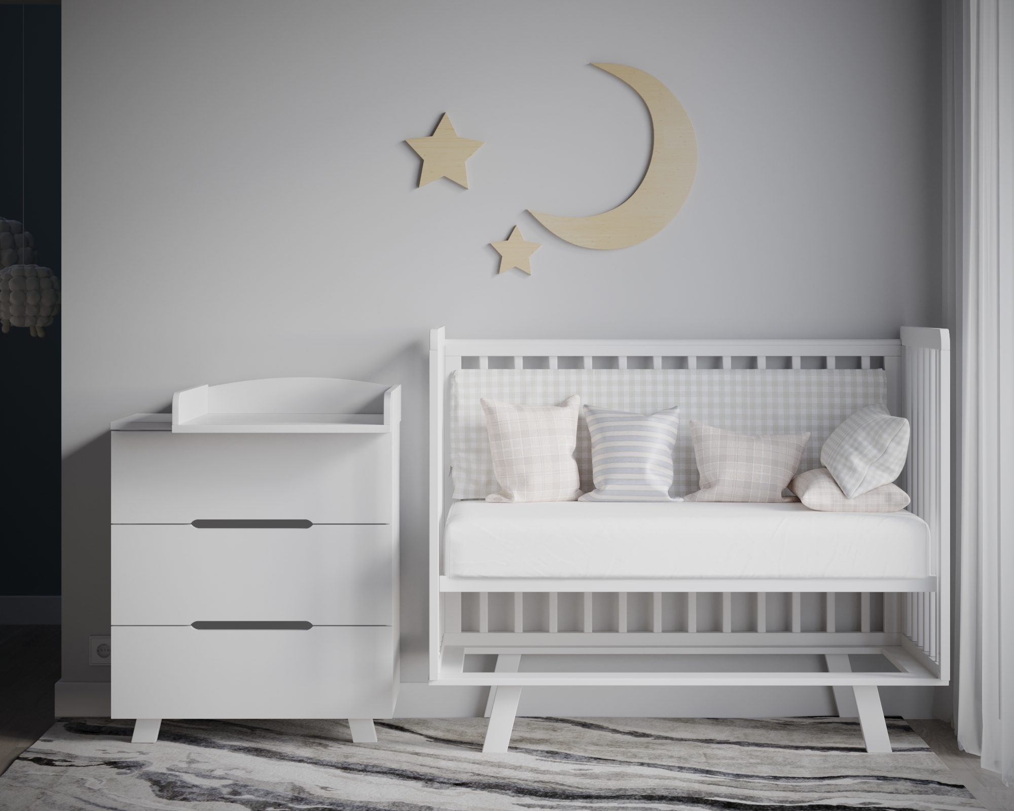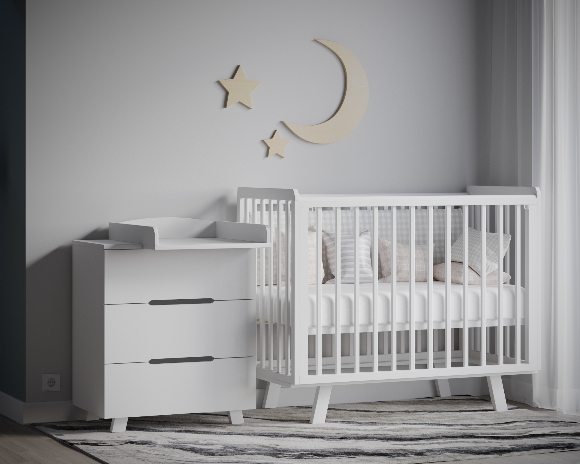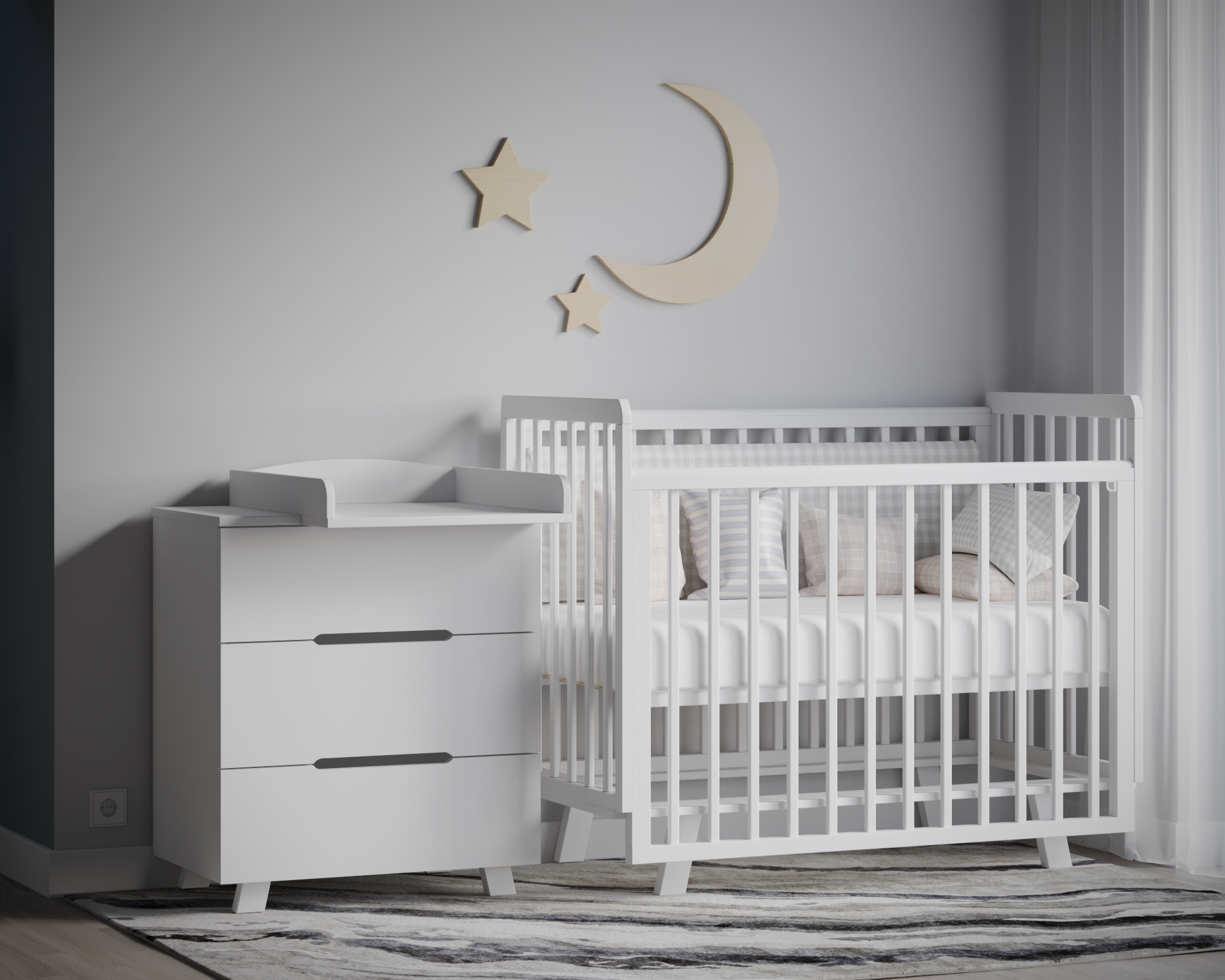 Верхние планки оснащены силиконовыми накладками, чтобы малыш не повредил первые зубки и поверхность кроватки.
