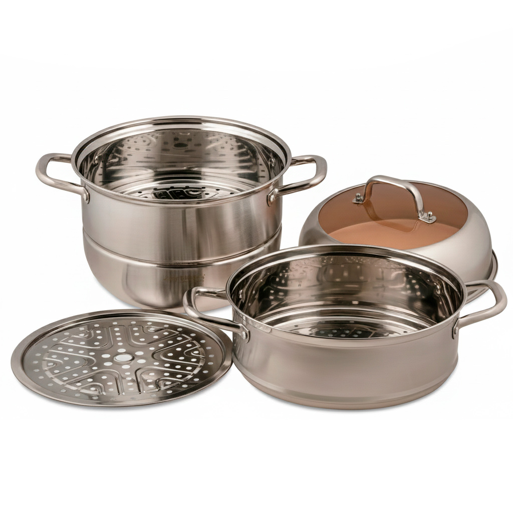 Кастрюля-мантоварка-пароварка Jolly Kitchen 3-в-1 — универсальное решение для здорового питания! Многофункциональная посуда из нержавеющей стали заменяет три прибора. Одновременно готовьте 3 разных блюда на пару, сохраняя витамины и натуральный вкус продуктов без масла. Подходит для всех типов плит, включая индукционные.