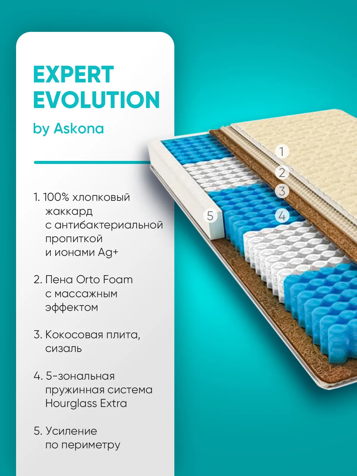 - Матрас средней жесткости Expert Evolution производится на основе блока независимых пружин «Песочные часы Extra», который обеспечивает бережную поддержку позвоночника благодаря усиленным пружинам в пяти анатомических зонах.