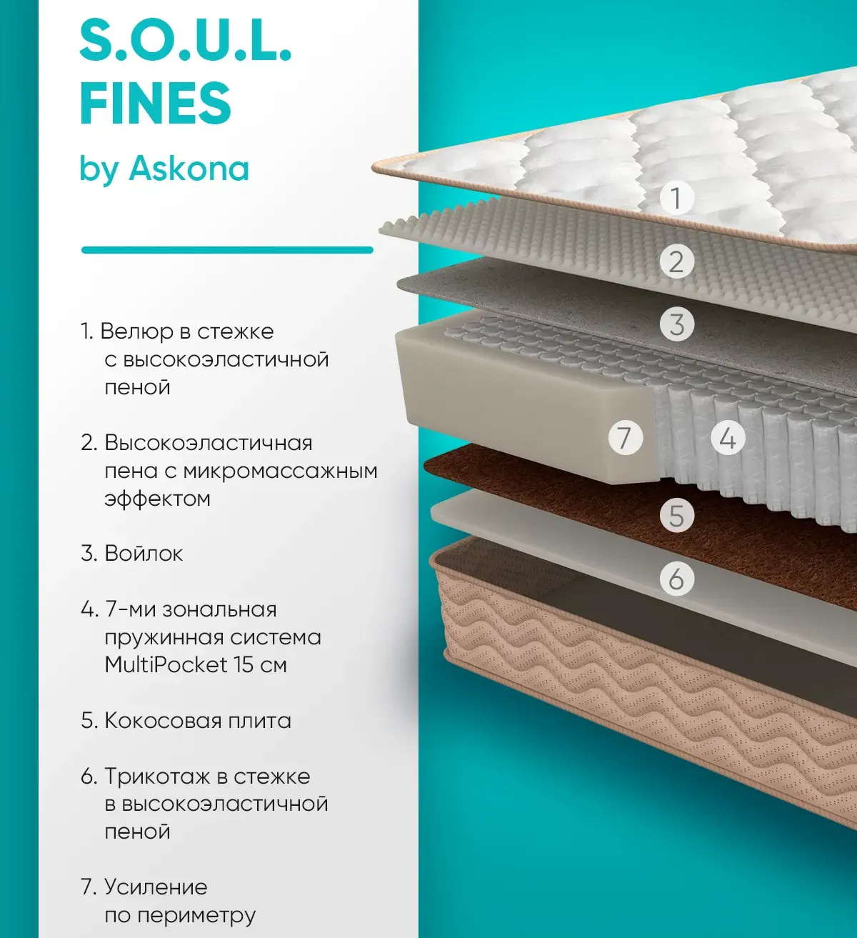 Все модели матрасов коллекции S.O.U.L. выполнены с применением эксклюзивных материалов: мягкий и теплый велюр в сочетании с высококачественным трикотажем дарит матрасу шикарный внешний вид. Приятная мягкая цветовая гамма делает матрас уютным и, по-настоящему, «домашним».