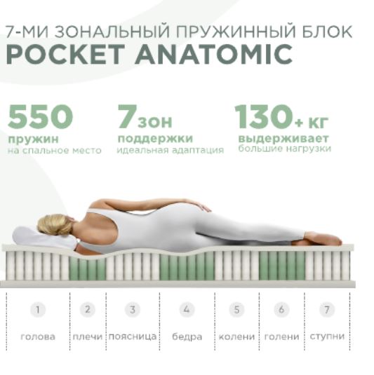 Пружинная система Pocket Anatomic 7zones обеспечивает удобство сна в сочетании с поддержкой, необходимой для уменьшения беспокойства партнера и совместного движения.