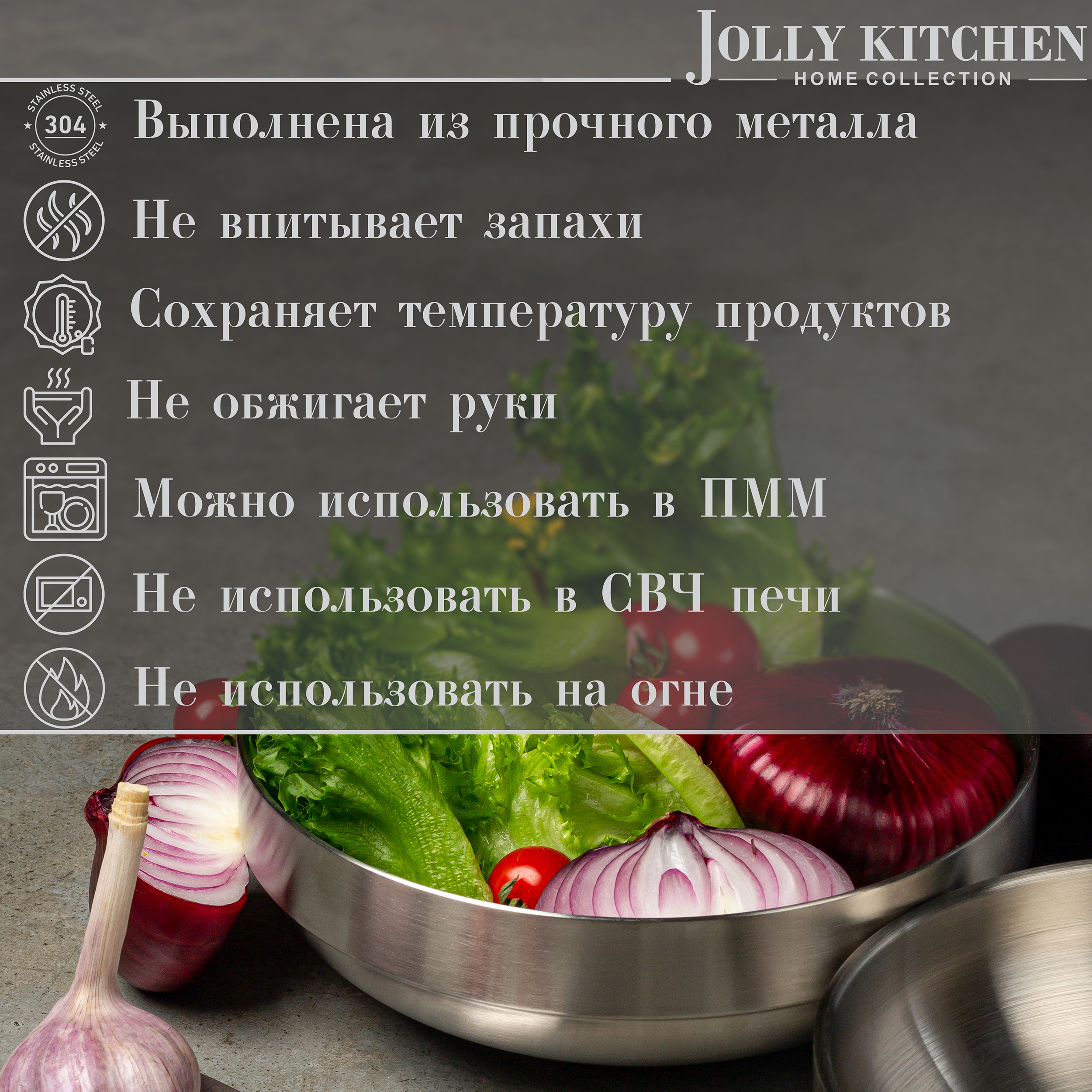 Выполнена из прочного металла. Не впитывает запахи – хранение или маринование продуктов. Сохраняет температуру продуктов. Не обжигает руки. Можно использовать в посудомоечной машине. Не подходит для СВЧ. Не подходит для любых видов плит. Нельзя использовать на огне.