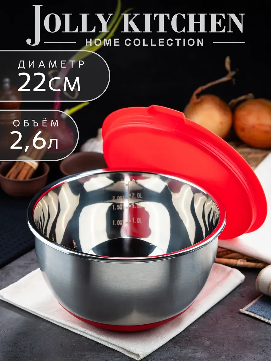 Миска Jolly Kitchen с крышкой, красная, 22 см, нержавеющая сталь 0,5 мм, объем 2,6 л