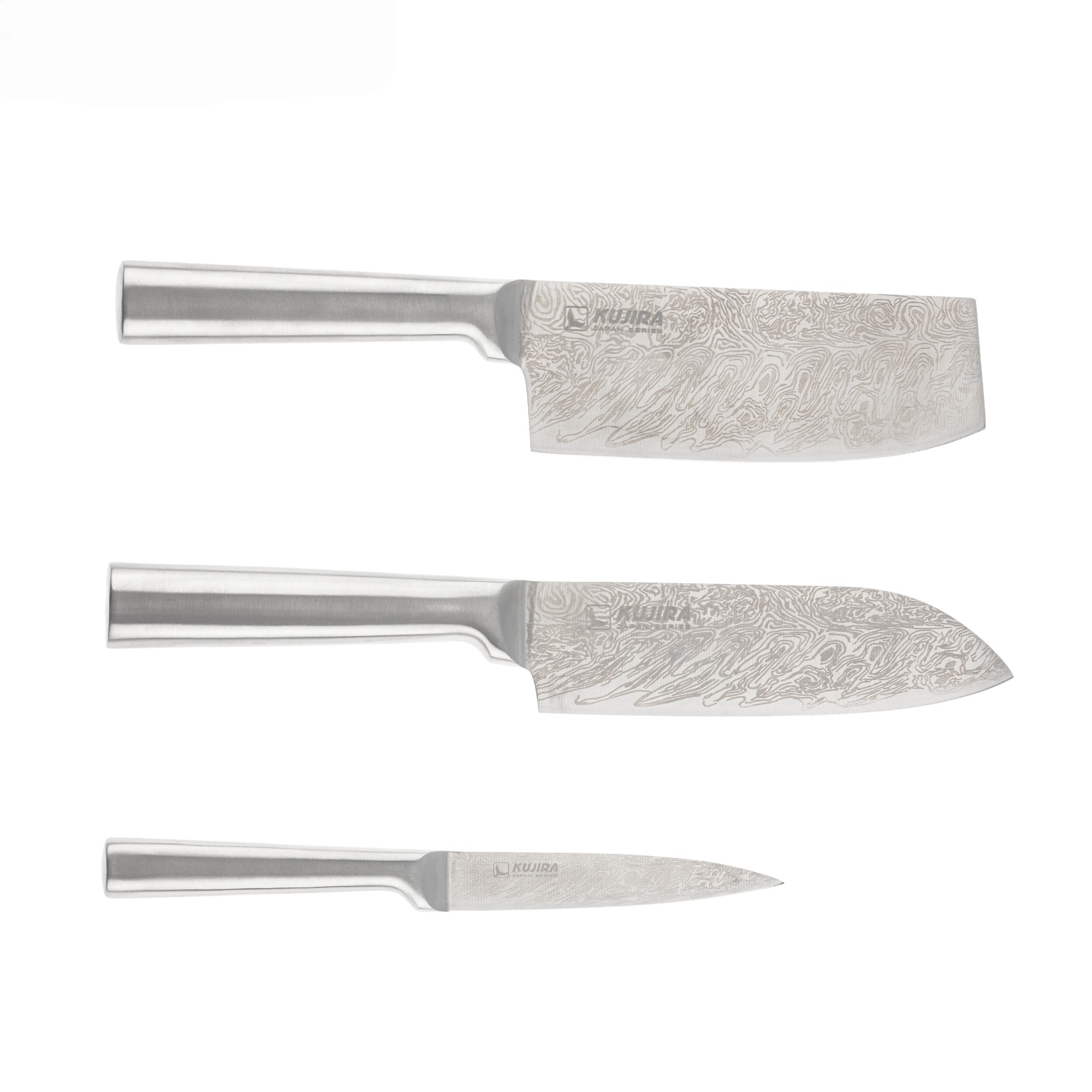 Набор ножей Kujira Japan Knife Set AUS-6 состоит из трех ножей разной формы. Размер лезвий 2 ножа - 16,5 см и 1 нож - 11,5 см.