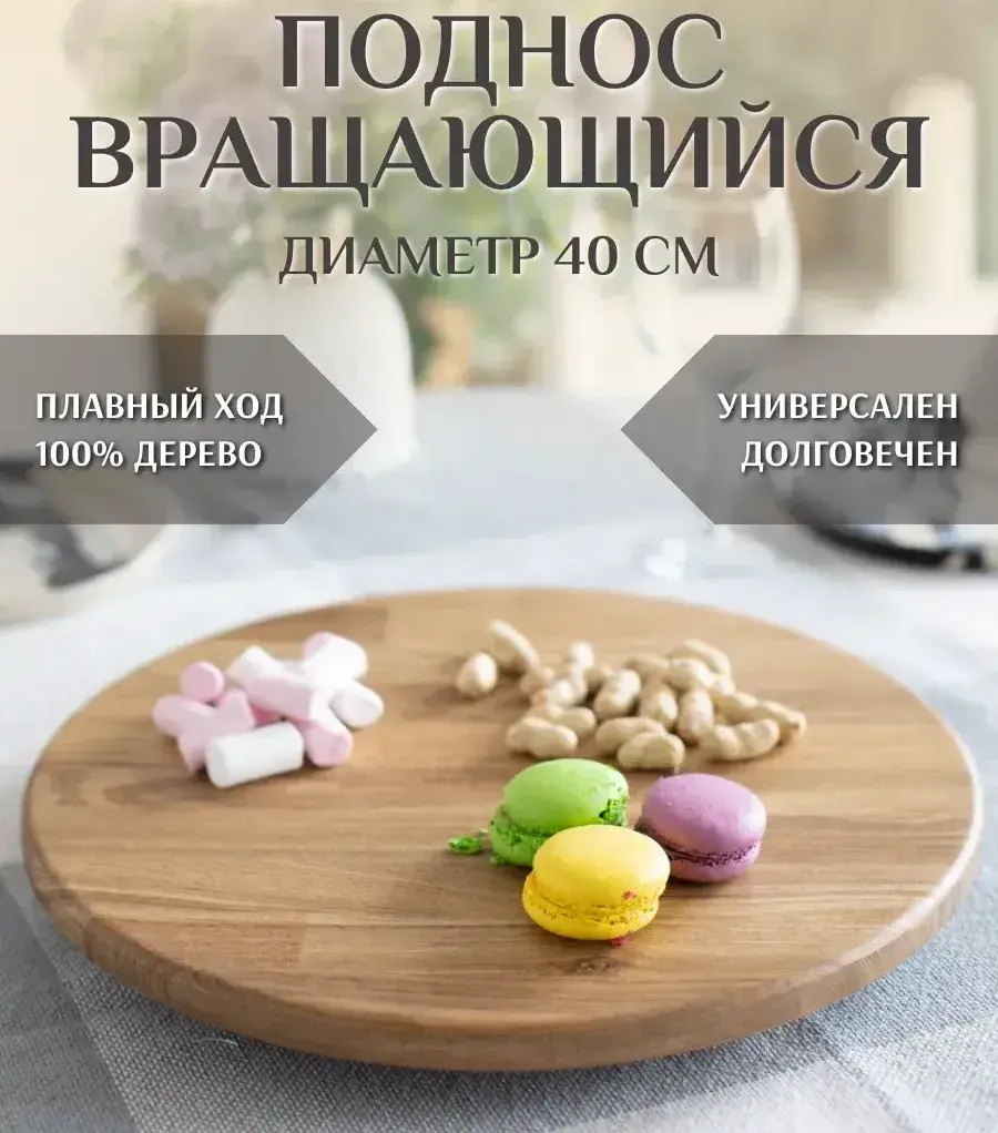 Вращающийся поднос для подачи блюд из бамбука, диаметром 40 см предназначен для сервировки стола различными закусками, подачи пиццы и роллов, размещения фруктов и овощей, а так же для компактного хранения небольших баночек со специями и приправами. Крепкий, прочный, долговечный и экологически чистый материал. Имеет неповторимую текстуру и выразительность рисунка, что придает каждому изделию свою индивидуальность. Важно понимать, что дерево это живой материал, имеющий свой оттенок и игру текстуры древесины, дающий незначительные отличия от изображений.