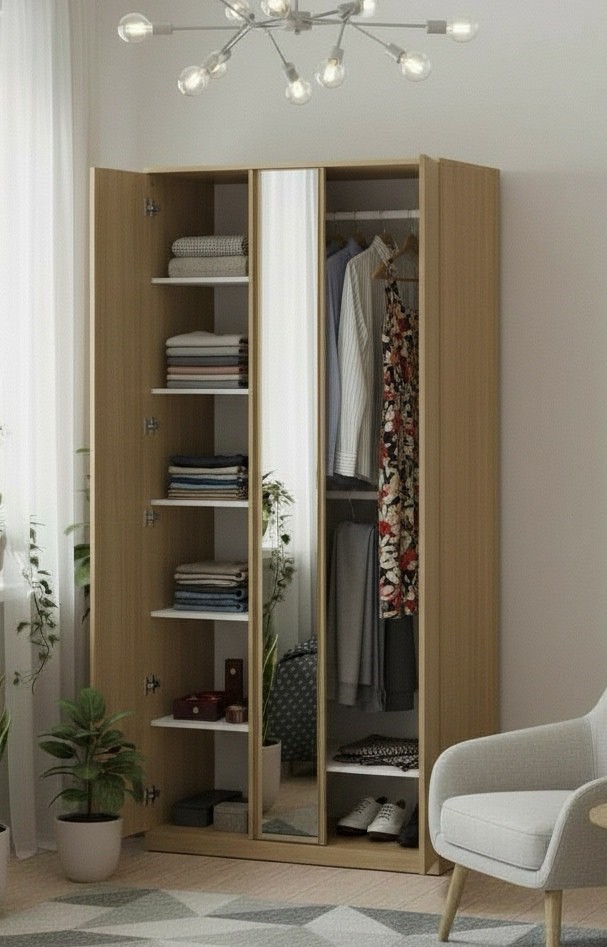 - Эстетичное зеркало: Зеркальная дверь без видимых креплений расширяет пространство и наполняет его светом.