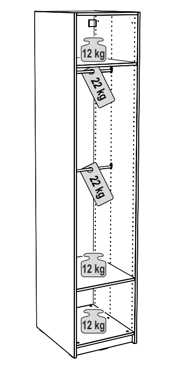 Размер стеллажа 50×58,9×232,8 см. Состоит из корпуса, 2-х полок и 2-х штанг. Материал: ДСП.