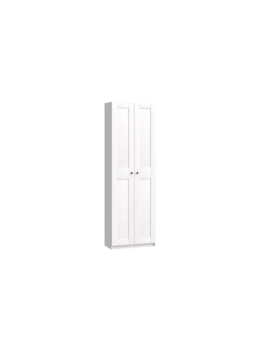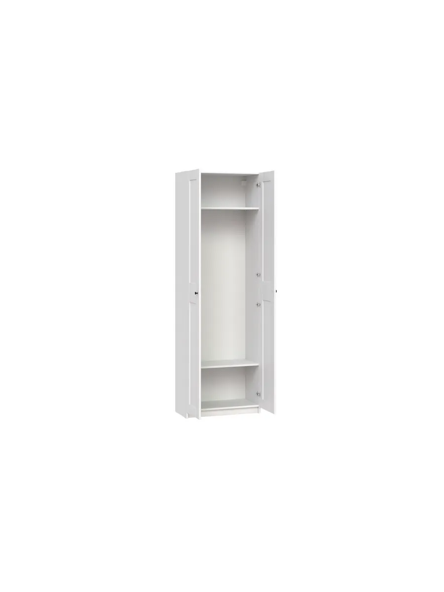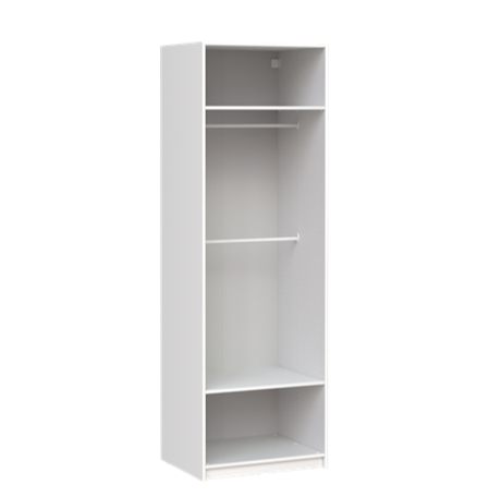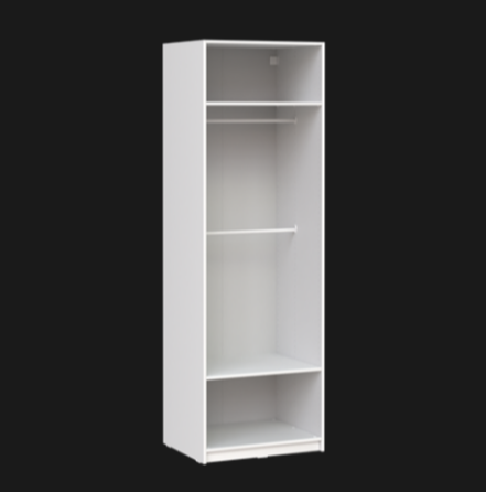 Размер стеллажа 75×58,9×232,8 см. Состоит из корпуса шириной 75 см, 2-х полок и 2-х штанг. Материал: ДСП.