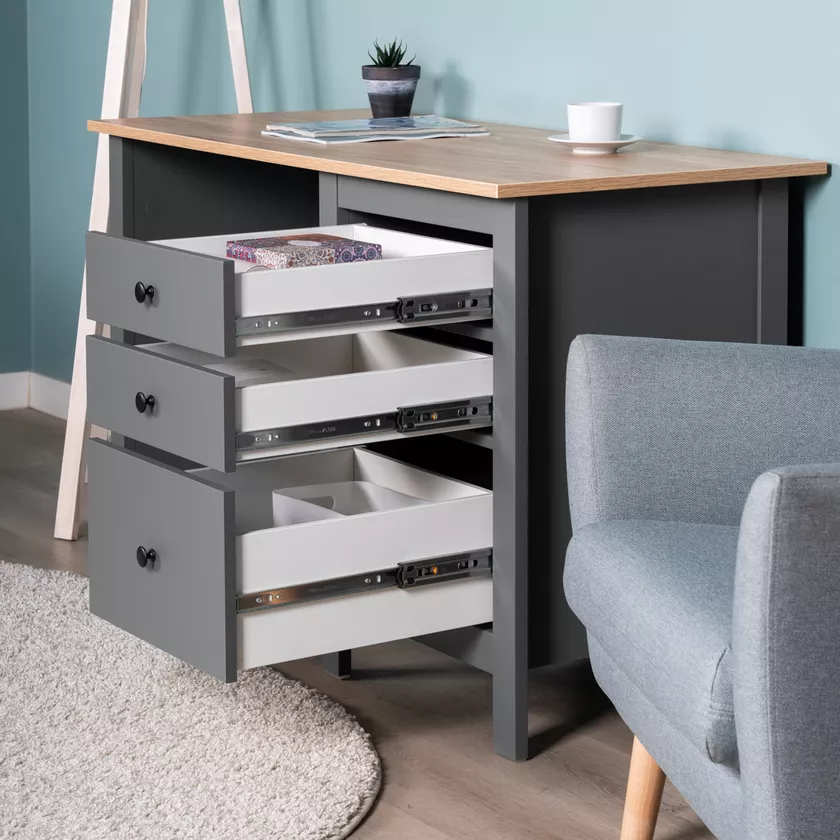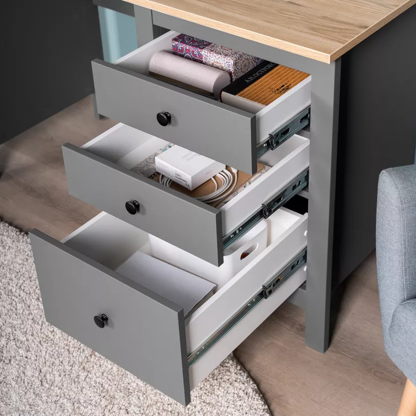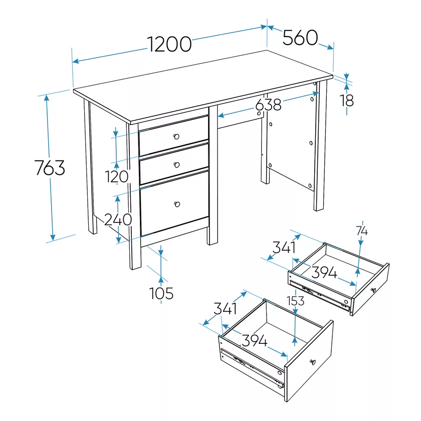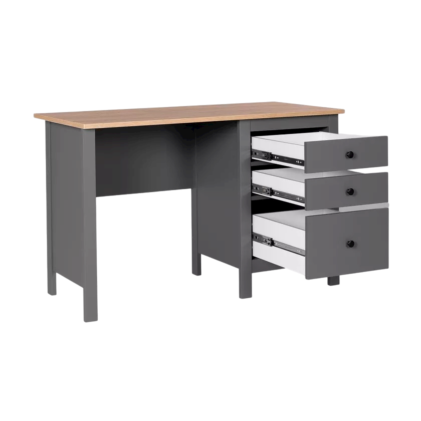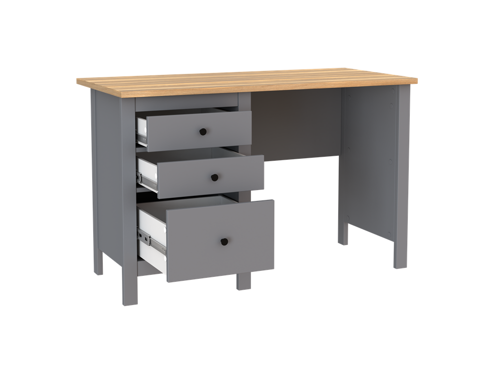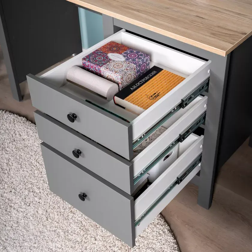 Стол оснащен тремя удобными выдвижными ящиками с направляющими полного выдвижения и доводчиками, которые обеспечивают плавное и бесшумное открывание. Эти ящики предназначены для хранения канцелярии, документов, учебников и других мелочей, которые всегда должны быть под рукой. Такое решение помогает поддерживать порядок и организованность, создавая комфортные условия для работы или учебы. Несущие элементы стола выполнены из МДФ, что гарантирует его долговечность и устойчивость даже при интенсивном использовании. Пространство под столешницей позволяет удобно расположить ноги, а сама столешница предоставляет достаточно места для работы с документами, ноутбуком или другими необходимыми предметами.