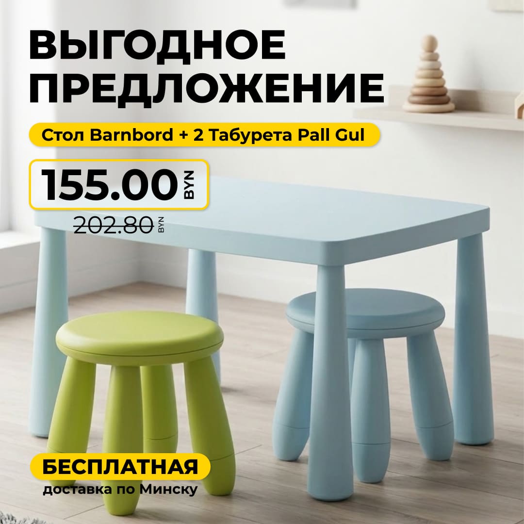 Покупайте КОМПЛЕКТ стол BARNBORD ГОЛУБОЙ + 2 табурета PALL GULL ГОЛУБОЙ и ЗЕЛЕНЫЙ за 155 рублей вместо 202,80 рублей!